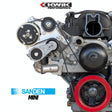 This bracket mounts the popular Sanden mini compressor (SD7B10) just outside the passenger’s side valve cover and is driven by one main 6-rib serpentine belt.