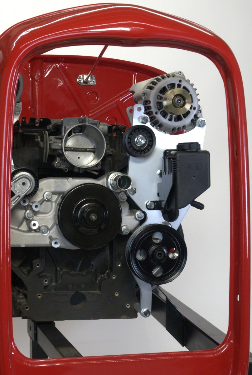 Narrow Street Rod Alt/PS relocation bracket system for LS engines with Camaro F-Body (1998-02) and GTO (2004-06) crank pulley and water pump spacing.