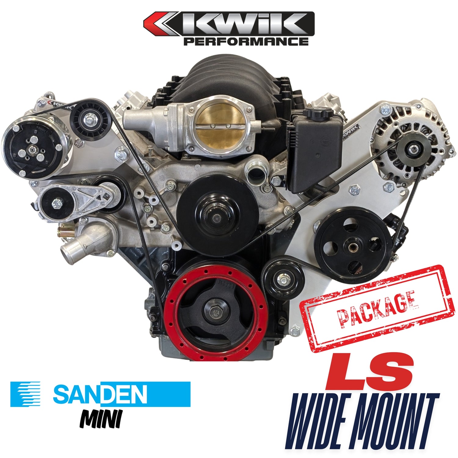 This serpentine system is similar to our original wide-mount package but this one uses the Sanden mini compressor instead of the larger HD compressor. We include an LS3 Corvette balancer and water pump and this turns your truck engine into the shortest LS package.