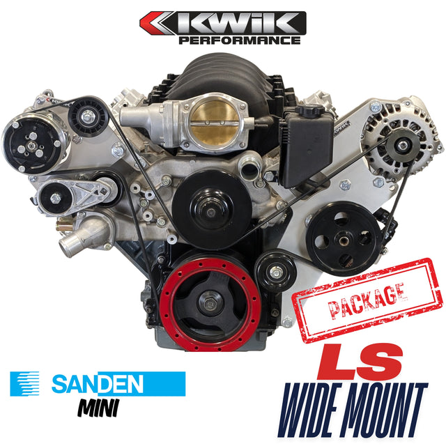 Our Kwik Wide Mount Mini Pull-Out Package gives you a whole fresh front drive system with the advantages of a Sanden Mini AC compressor. The mini compressor reduces the overall width by just over one inch, saves a few pounds and is rated for higher RPM.