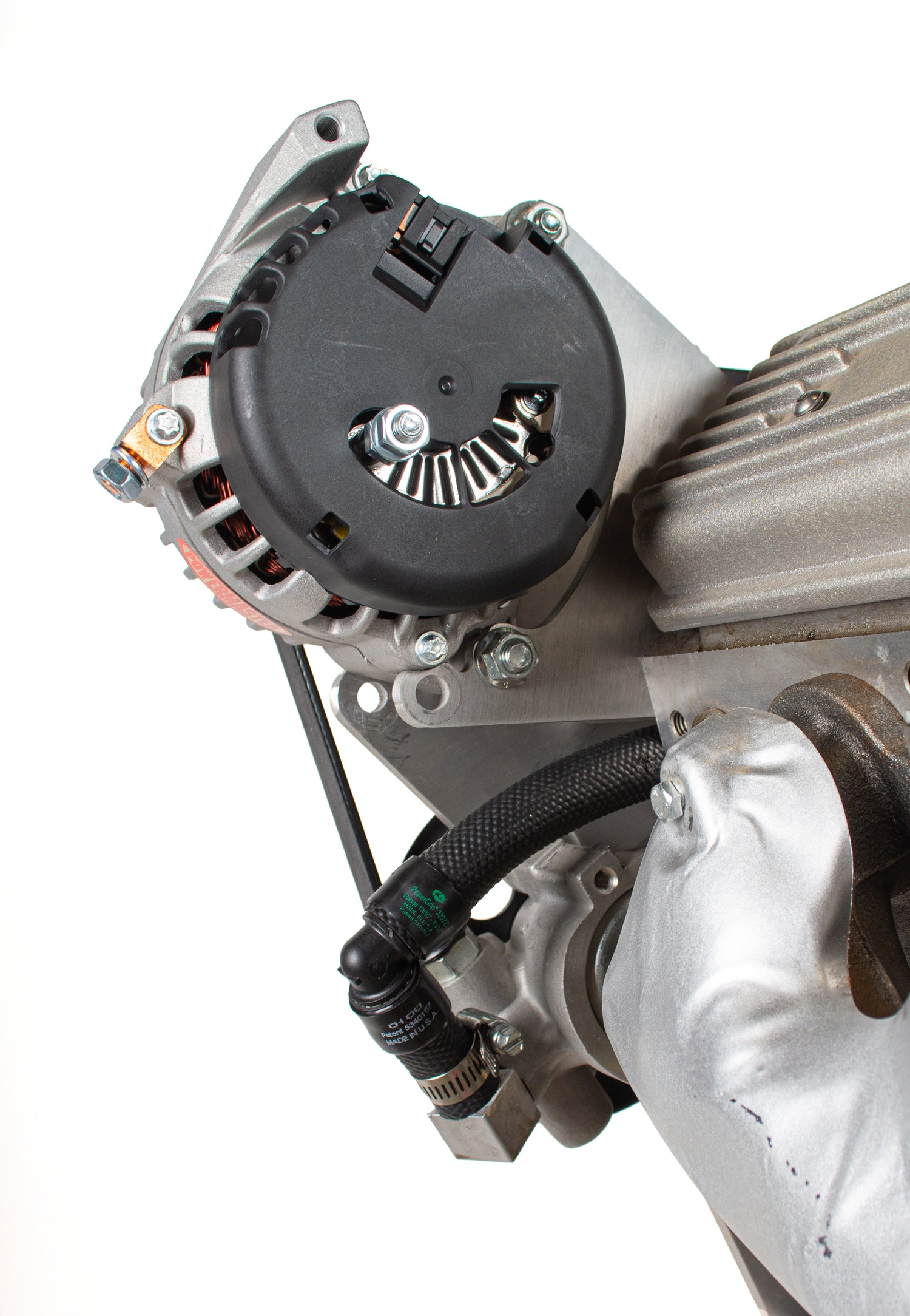 90° power steering feed hose for Kwik Performance LS Wide Mount Alternator Power Steering brackets: K10166, K10167, K10168.