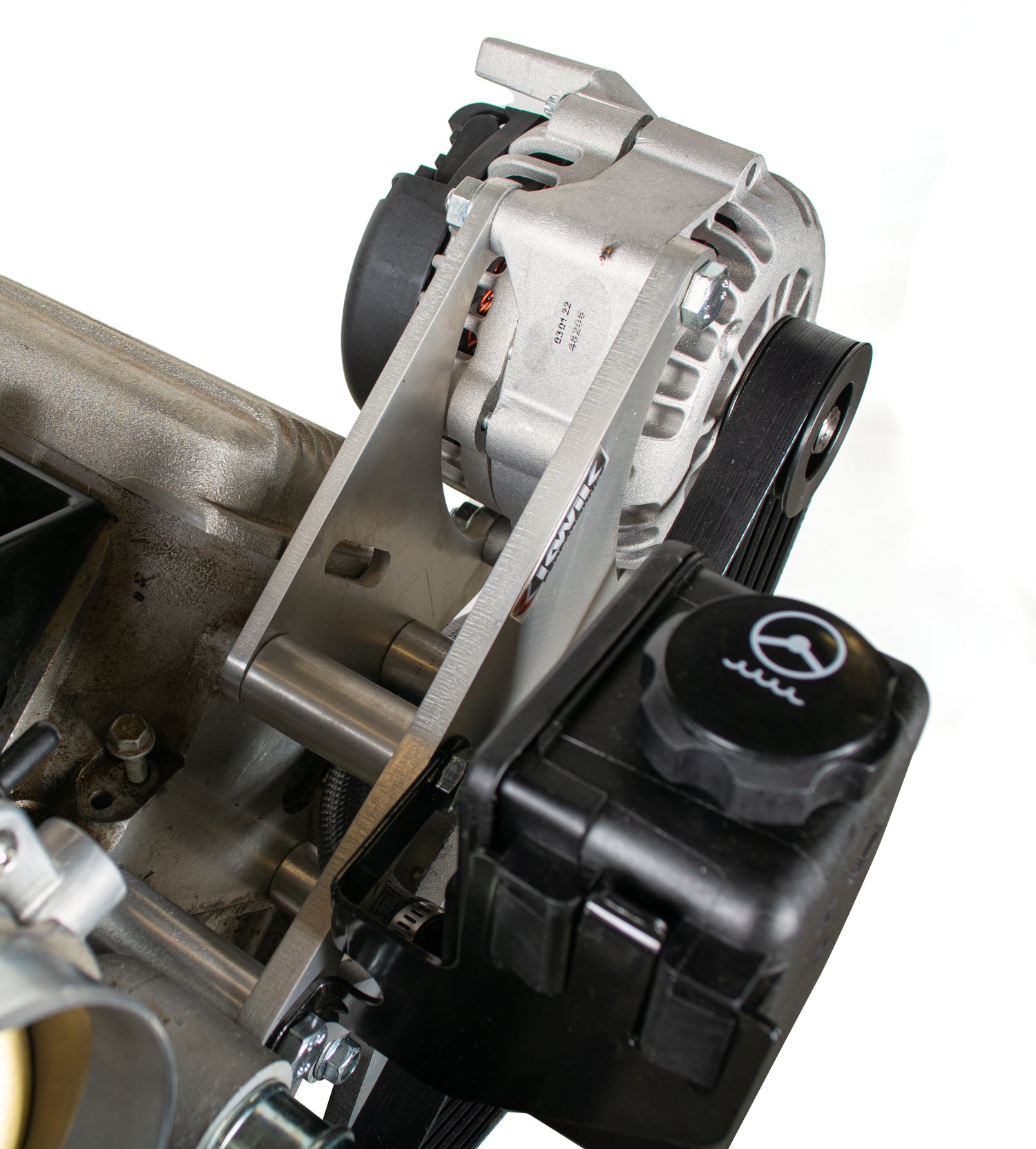Our LS wide mount Alt/PS is designed to mount the GM remote reservoir on the front of the bracket. There is a window in the front plate that allows the feed hose to snake down to the hose barb on the power steering pump. This can be accomplished with a simple 5/8" piece of hose and some hose clamps. However, the hose may kink slightly.