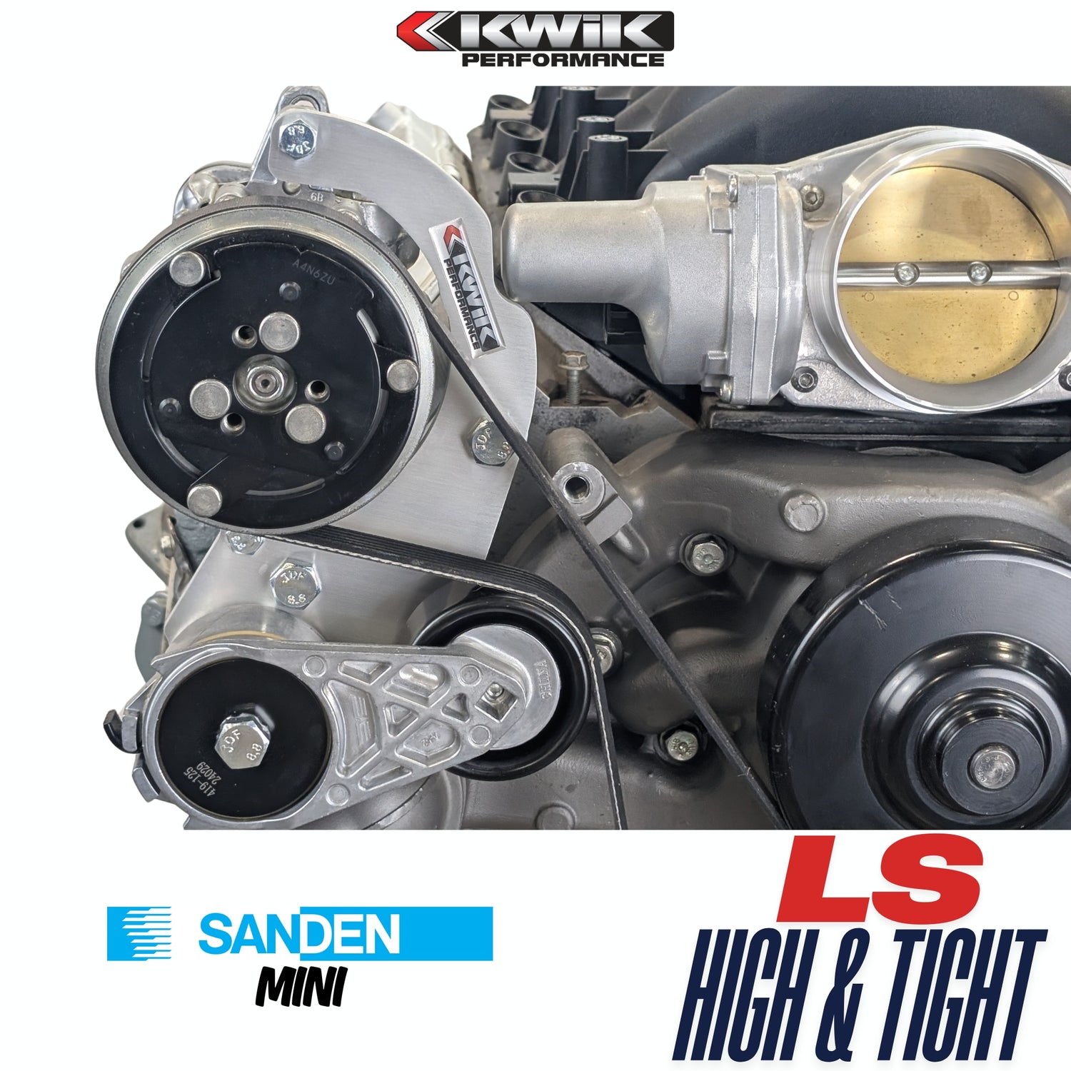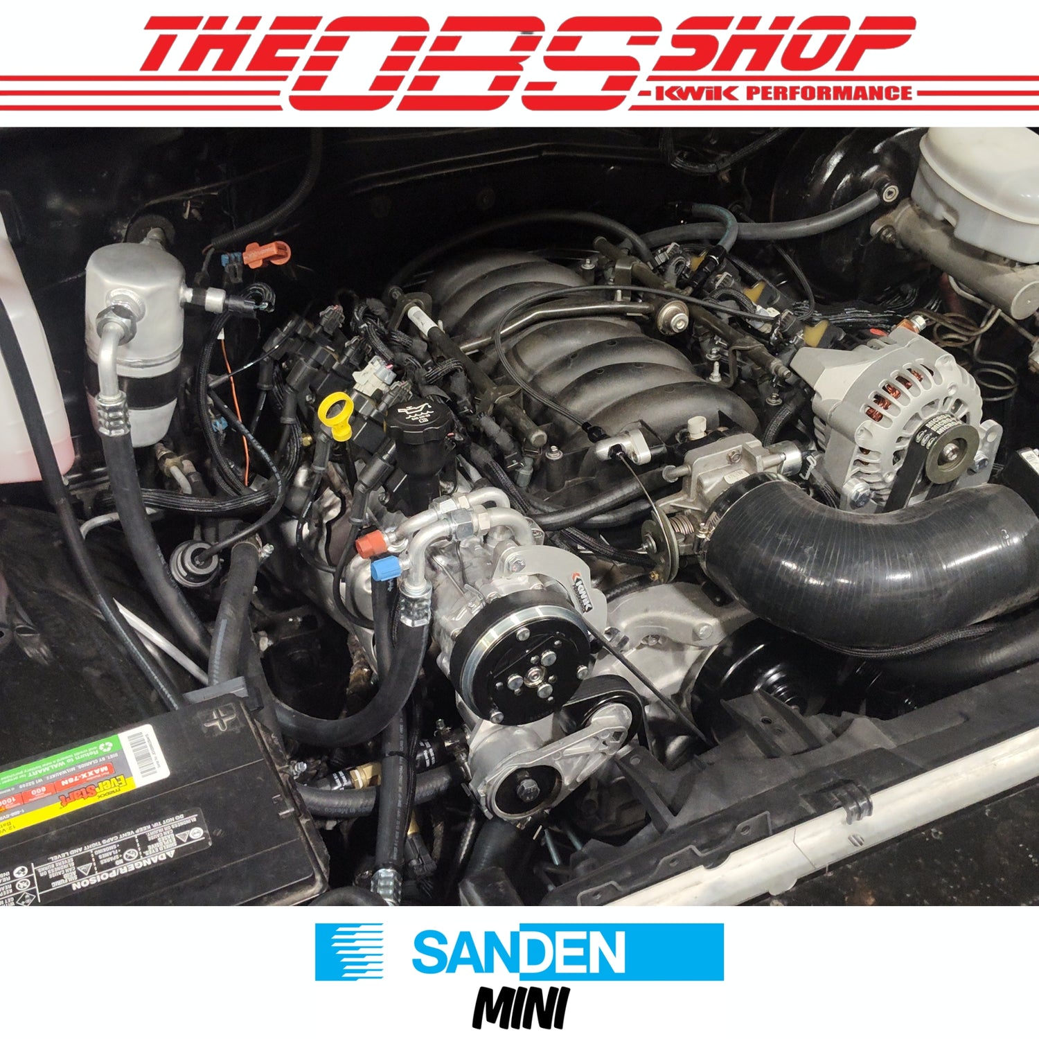 Un soporte de aire acondicionado estrecho que monta el compresor “mini” Sanden SD7B10 (7176) frente a la culata del lado del pasajero.
